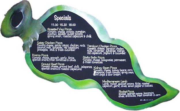Baked In Elwood - Melbourne These clients didn't want just a regular menuboard. Instead, we cut out a huge capsicum, applied layers of 'leaves' to the stalks and inserted the blackboards inside. | |