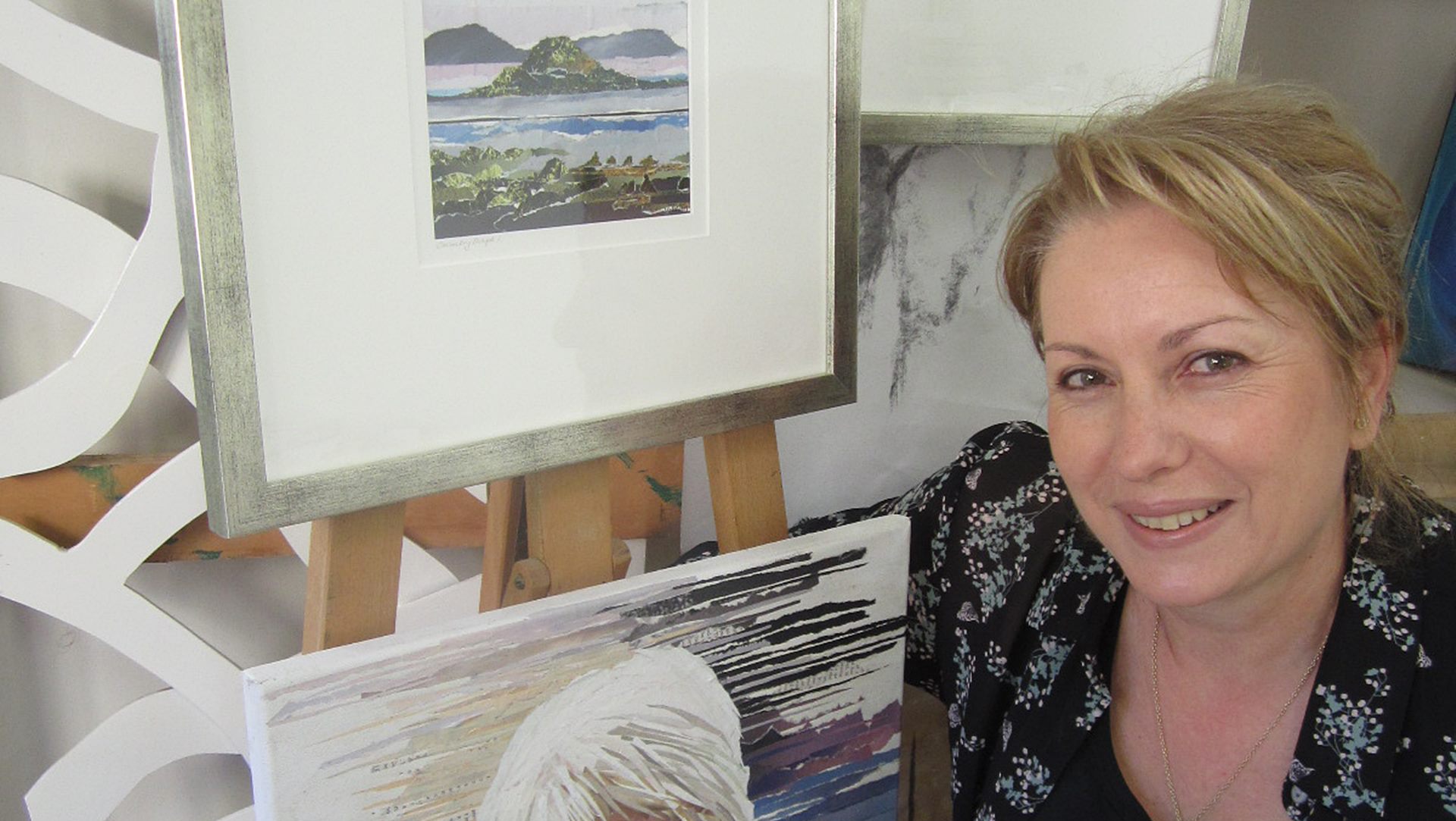 | Vasy's collage landscapes are complex compositions of colour, cut from magazines and pieced together into peaceful natural scenes. What appear as painted landscapes from a distance are actually compositions of unrelated images. Each apparent 'brushstroke' is an intricate play of colour cut from unwanted magazines and newspapers, detached and fragmented. The attempt is to capture the simplicity of nature and evoke a sense of peace from material which is mass produced and so readily discarded. Mass print, representative of today's complexity, is pieced together into scenes that invite us to connect with nature and momentarily transport us to a simple place. Lines and Layers ← Pieces and Strips I look at a distant landscape and see lines. Beginning with the horizon, I build a picture in linear strips above and below this line. Pieces of discarded print merge together to form land, sea and sky. Coloured strips are ‘blended’ the same way you would with paint. I either tear or cut. A torn edge is raw and unpredictable and can resemble the distant crest of a rolling wave or a soft whisp of cloud. A clean cut defines the horizon or the sharp shimmer of a highlight. The transparent quality of thin matt print ‘melts’ in to the canvas when pasted down. This together with overlapping, gives depth to a cloudy sky. Alternatively, thick gloss print highlights solid features within a landscape. |